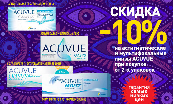 - Скидка 10% на астигматические и мультифокальные линзы ACUVUE при покупке от 2-х упаковок