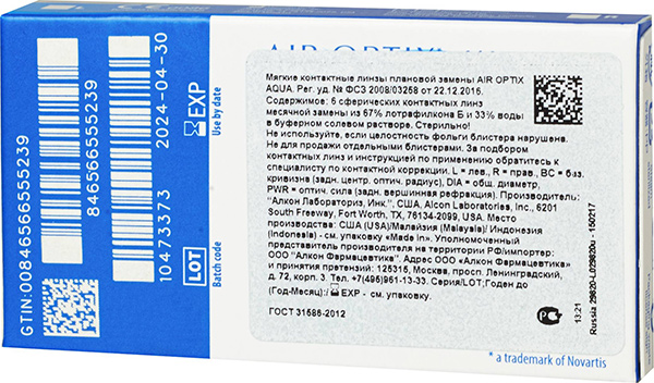 Компания Alcon внедрила в производство линз Air Optix Aqua технологию плазменной обработки, благодаря которой они становятся невероятно комфортными и безопасными. Поверхность их настолько гладкая, что они остаются чистыми и увлажненными на протяжении всего времени ношения. Офтальмологические изделия не пересыхают и обеспечивают постоянное чувство свежести в глазах. Изготавливаются Air Optix Aqua из Лотрафилкона Б — гидрогеля с оптимальным уровнем влагосодержания и высочайшим показателем кислородопроницаемости — 110 Dk/t. Поэтому данные линзы называются «дышащими». Роговица в них всегда имеет доступ к кислороду. Вы можете не снимать оптические изделия по несколько дней. Вас не будут беспокоить сухость в глазах, раздражение и другие проявления дискомфорта. Air Optix Aqua — превосходное зрение в любое время суток Дизайн представленной модели асферический. В таких линзах не возникают искажения зрения, а также блики и ореолы, появляющиеся в темное время суток. Более того, контрастность изображения не снижается при недостаточной освещенности. Линзы гарантируют четкое и контрастное зрение в сумерках. Выпускаются Air Optix Aqua с положительными и отрицательными диоптриями с шагом 0.25 дптр. Подобрать вариант с необходимой оптической силой сможет каждый. Линзы способны корректировать высокие степени близорукости (до −10 дптр) и дальнозоркости (до +6 дптр). Преимущества Air Optix Aqua коррекция тяжелых форм дефектов рефракции; несколько режимов ношения: дневной, гибкий, пролонгированный; популярный график замены в один месяц; устойчивость к белковым и липидным отложениям. Перед покупкой линз и выбором режима ношения проконсультируйтесь с окулистом.