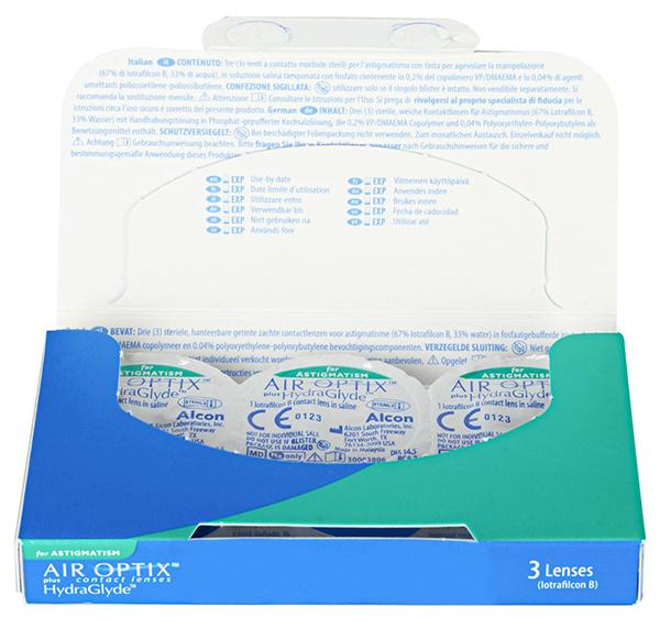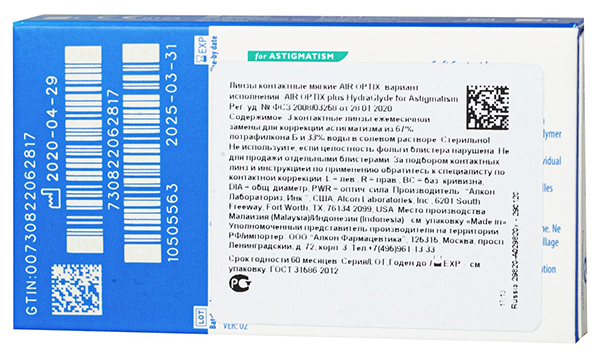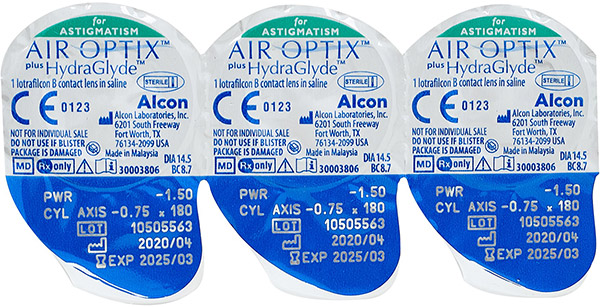 Астигматическая модель Air Optix plus Hydraglyde for Astigmatism (3 шт.) рассчитана на месячный срок эксплуатации. Таким образом, упаковки хватает на целый квартал (для одного глаза).