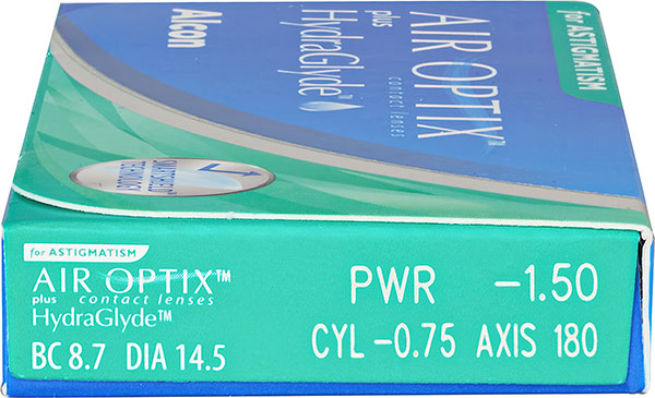 Контактные линзы Air Optix plus Hydraglyde for Astigmatism предназначены для коррекции астигматизма и миопии до -8D или дальнозоркости до +4 диоптрий. Модель выполнена из силикон-гидрогелевого материала Лотрафилкона B. Он имеет высокий коэффициент кислородопроницаемости (108 единиц) и оптимальный уровень влаги в материале — 33%. Эти характеристики отлично подходят для режима дневного ношения.