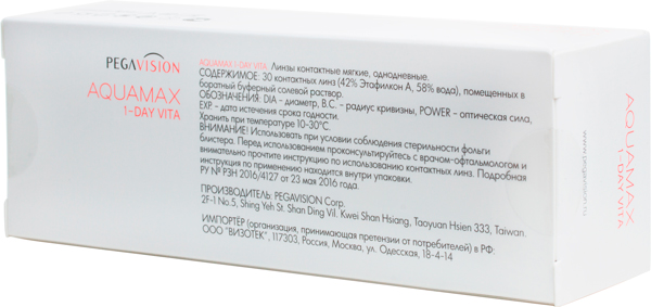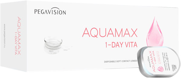 Aquamax 1-Day Vita — уникальные контактные линзы, при ношении которых происходит питание глаз витаминами. Производит эту модель компания Pegavision. Она применила новую технологию создания контактной оптики и стала включать в буферный раствор витамины: B12, B6 и E. Они способствуют снятию с органов зрения напряжения, обеспечивают восстановление клеток, благодаря чему повышается комфорт эксплуатации контактной оптики. Также в состав буферного раствора входит гиалуроновая кислота, которая увлажняет ее и наделяет гидрофильными свойствами.