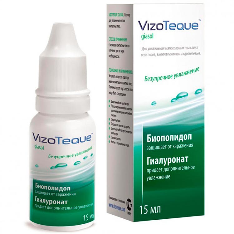 В состав жидкости входит гиалуроновая кислота, эффективно увлажняющая поверхность оптики и роговицу. Мощный дезинфицирующий компонент, гипромеллоза, уничтожает микроорганизмы, которые поражают конъюнктиву глаза, а также обладает регенерирующим действием. Капли Vizoteque Giasol врачи рекомендуют использовать новичкам перед надеванием контактной оптики. Они нейтрализуют чувство дискомфорта от непривычных ощущений. Флакон 15 мл расходуется очень экономно, и его хватит на месяц использования.