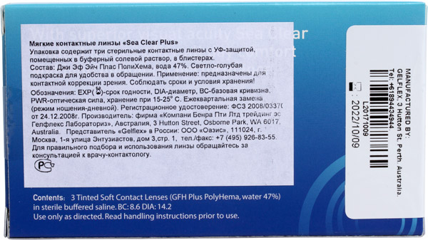 Sea Clear — контактные линзы, производимые австралийской компанией Gelflex (Си Клиа от Гелфлекс) из высокопрочного материала GFH Plus PolyHema. Эти средства контактной коррекции зрения получили превосходный дизайн и повышенную механическую прочность, которая увеличивает продолжительность ношения линз до трёх месяцев, потому купить Sea Clear действительно выгодно. Данная контактная оптика производится с использованием технологии формования Radial Edge. Тончайший 0,035-миллиметровый край линзы позволяет избежать трения края Sea Clear о веко, что избавит вас от основного осложнения при ношении контактных линз, гигантского папиллярного конъюнктивита (GPC). Отзывы пользователей говорят об удобстве ношения Sea Clear. Они легко надеваются и снимаются, а тонкий край обеспечивает комфорт. В этот комплект входит три контактных средства коррекции зрения: у вас всегда будет возможность воспользоваться запасной линзой. Неоспоримым плюсом продукта от Gelflex является защита от ультрафиолетового излучения и легкий голубой оттенок для удобства обращения. Заказать контактные линзы Sea Clear по доступной цене вы можете у нас.